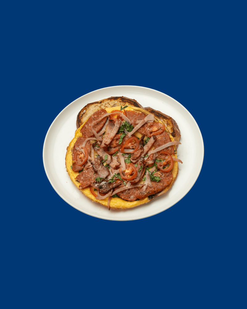 2x Poached eggs served with Turkish bread, beef sucuk on bed of yoghurt and garnished with tomato butter.