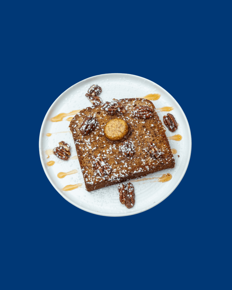 Toasted banana bread maple, cinnamon butter, pecan candy topped with whipped cream.