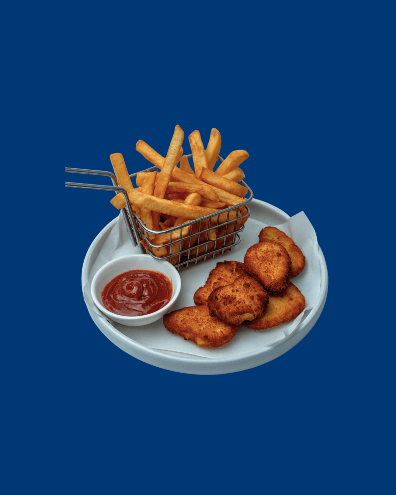 Tender chicken nuggets encased in a golden, crispy coating, served with chips & tomato sauce.