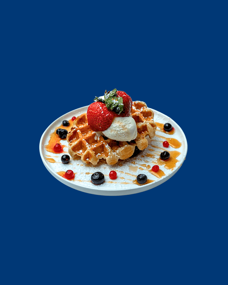 Toasted waffle, vanilla ice cream, mixed berries and Nutella. Dusted with icing sugar.
