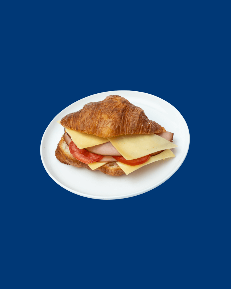 A flaky, buttery croissant filled with sliced ham, tomatoes and melted cheese, creating a delightful balance of flavors and textures.
