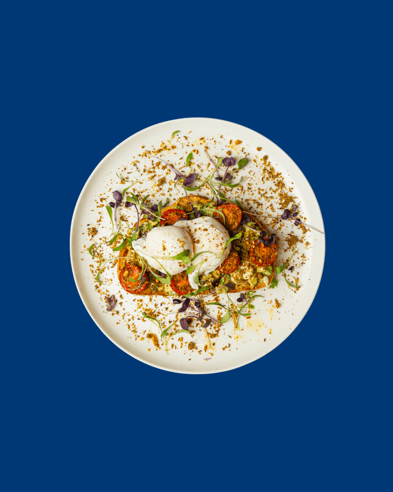 Smashed Avo, mint, feta cheese, cherry tomato and finished with dukkah and micro herb on slice of toast. Comes with poached eggs.