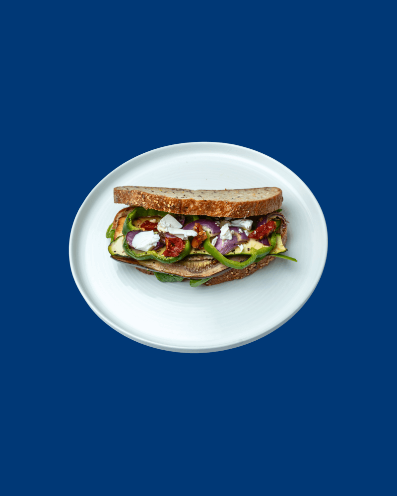 Grilled roasted eggplant, zucchini, green capsicum, onion and spinach, layered with a rich pesto spread and topped with sun-dried tomatoes and crumbled feta cheese, all nestled between slices of multigrain bread.