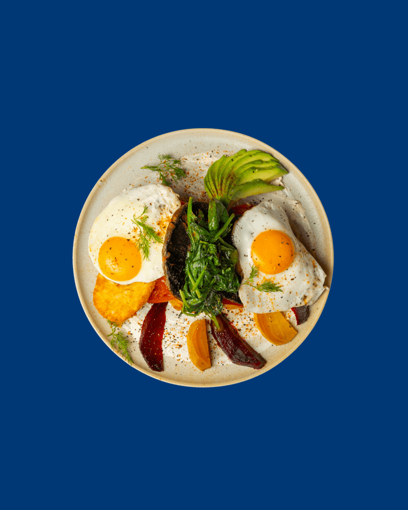 Mushrooms, hashbrown, beetroot, tomatoes, spinach, avo and feta cream cheese. 2x eggs of choice on slice of toast.