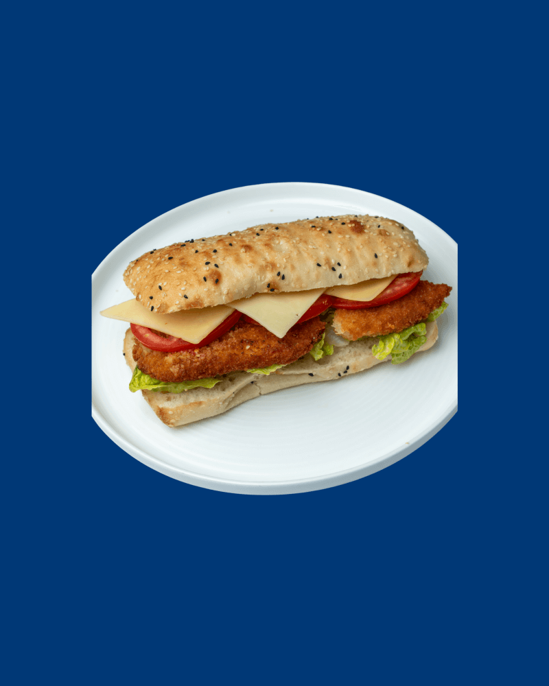 Tender, crispy chicken schnitzel topped with melted cheese, fresh tomatoes, and mayo, all served on toasted Turkish bread.