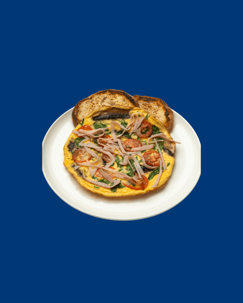 1x Toast, ham ,spinach, cherry tomatoes, mushrooms and cheese.