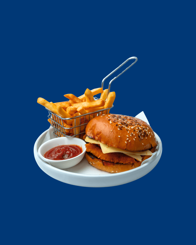 Grilled or Crispy chicken with lettuce, tomatoes, Smokey cheddar with burger sauce on milk bun